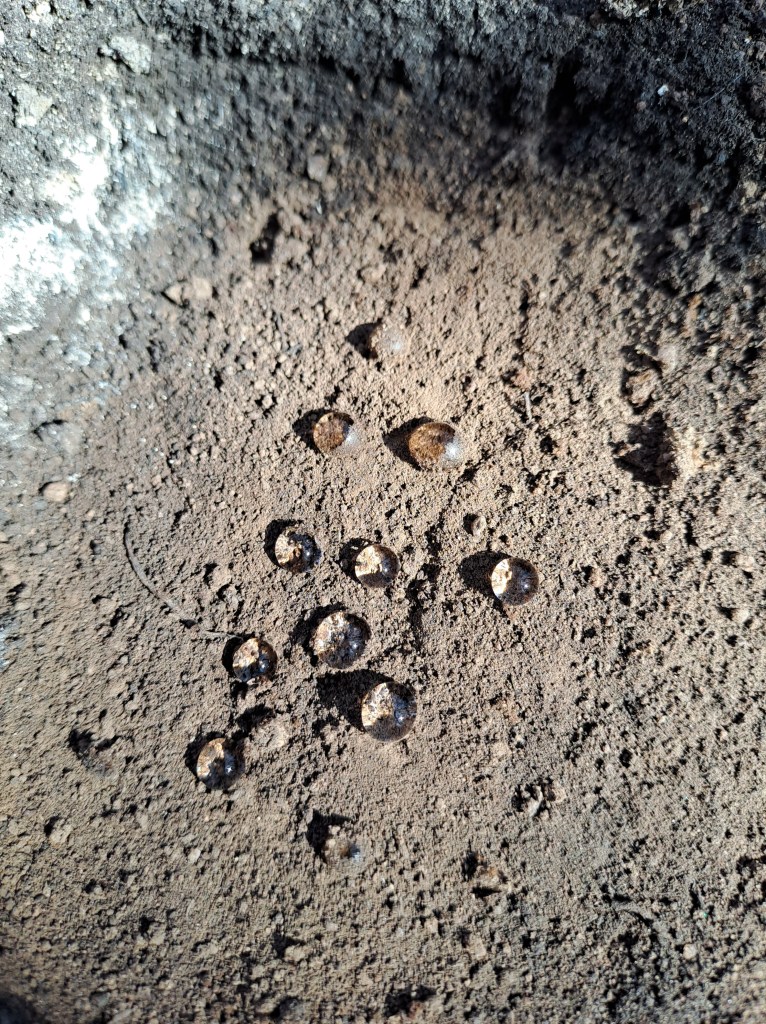 Fotografía de ensayos de medición de la hidrofobicidad del suelo en sitios post incendios forestales en sectores de muestreo seleccionados de Valparaíso. La perfecta formación de las gotas de agua sobre el suelo, demuestran la hidrofobicidad del suelo después de un incendio.