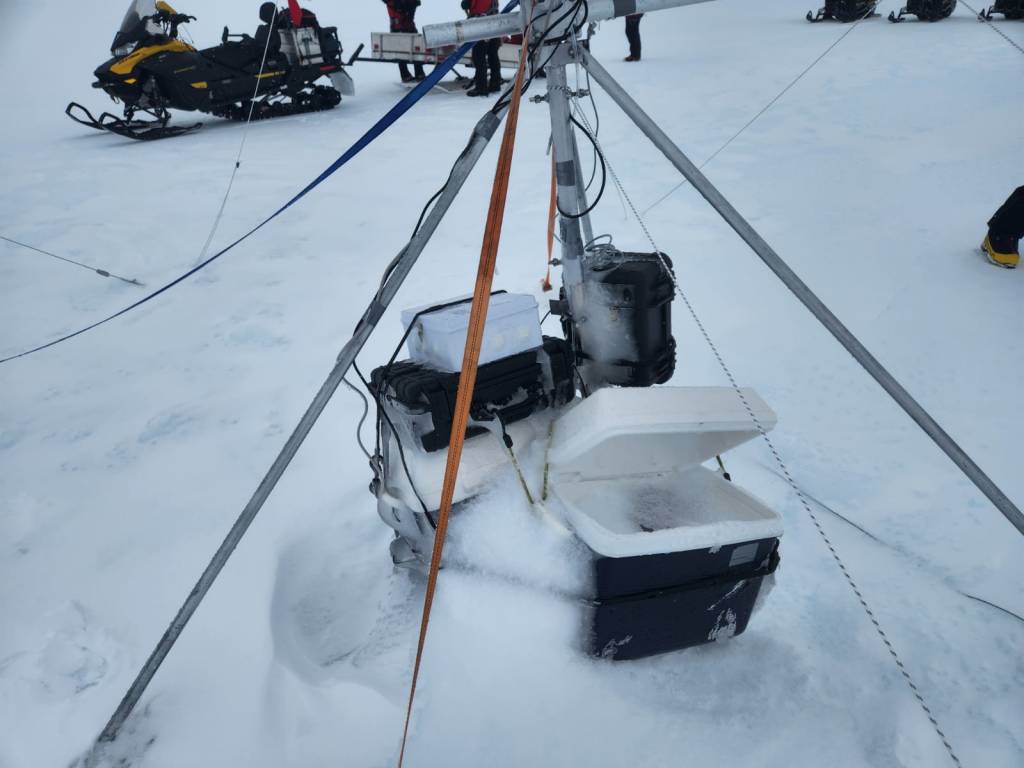 Avanzamos con cautela, la visibilidad reducida por la nevada y el intenso frío que mordía nuestros rostros atravesando como cuchillas el equipo de protección, hacían que cada metro recorrido se sintiera como un desafío, pero la determinación nos impulsaba a seguir. Cuando nos íbamos acercando al sitio, entre la nieve y el viento podíamos ver cómo se formaban poco a poco las figuras de nuestros equipos, al estar en el sitio el alivio fue indescriptible: los dos trípodes seguían en pie. ¡Los equipos estaban allí! La tormenta no había logrado arrancarlos de su lugar.