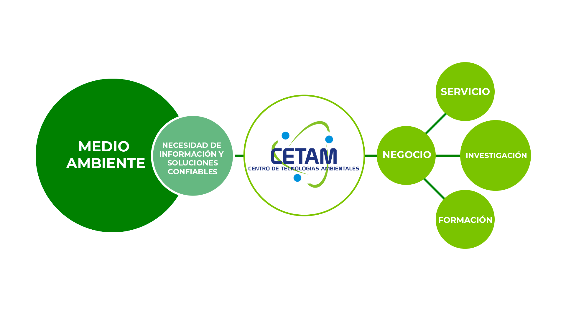 La propuesta de valor de CETAM se centra en satisfacer la necesidad de información y soluciones ambientales mediante un enfoque integral. CETAM actúa como un puente entre los desafíos del medio ambiente y las áreas de acción clave: negocio, servicio, investigación y formación. A través de estas áreas, CETAM proporciona oportunidades empresariales, apoyo técnico, desarrollo de conocimiento y capacitación, ofreciendo así una respuesta completa y efectiva a las necesidades medioambientales actuales.